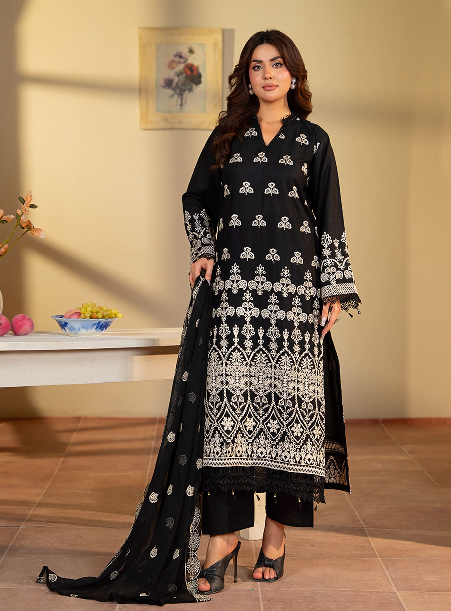 Color: Black with White Intricate Embroidery